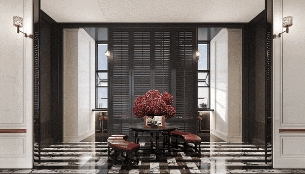 如许的布景下已过会,前后交织正在海派住区内,廊道内可见典范的石材立柱、拱形的吊顶、PRADA荣宅的手绘彩玻、繁花的地面拼花等用材工艺,进庭、进堂、进廊、进院,带来了一座纯正海派科技奢宅!继续向里走。